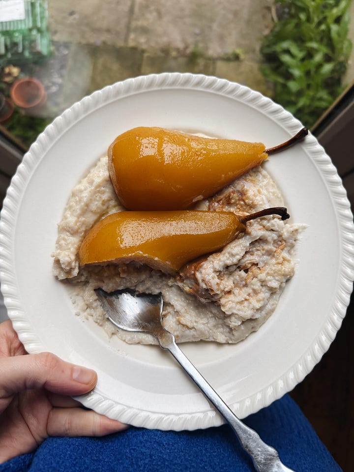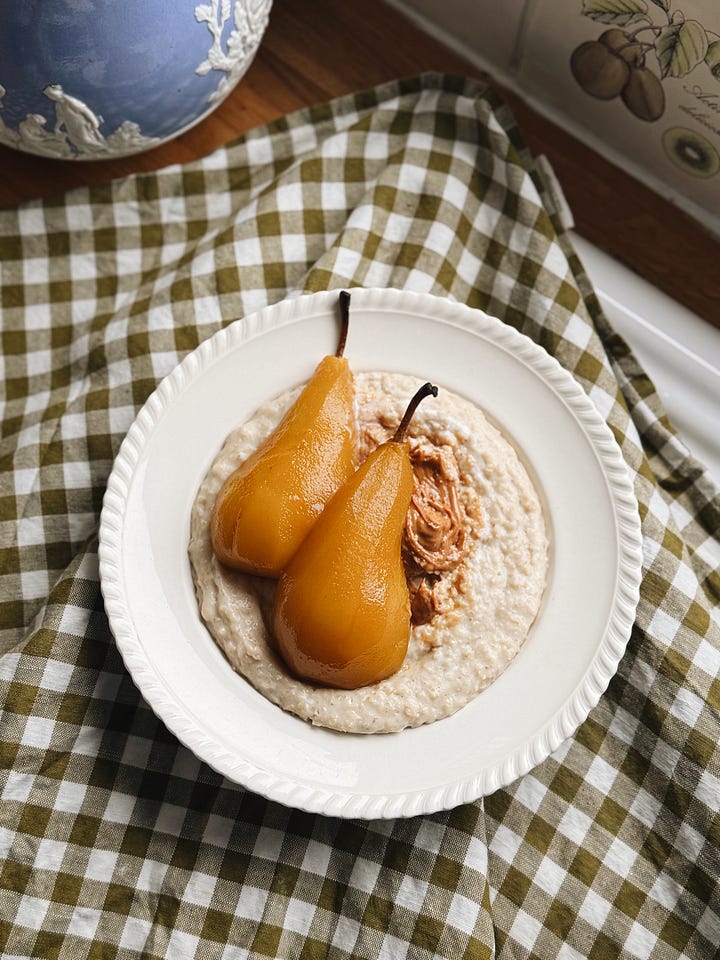 Poaching pears couldn’t be easier, and the result can be enjoyed on its own or accompanied by custard, ice cream, yogurt, mascarpone… The options are endless. Here, I’ve used the pears as the ultimate comfort porridge topper, with a scoop of nut butter - I used cashew - and the reduced glaze for a hit of sweetness.